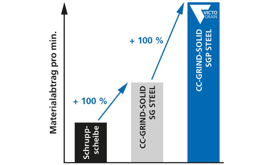 - Obwohl die VICTOGRAIN-Werkzeuge nur eine Schleifkornschicht haben, bieten sie eine überragende Standzeit – höher als Schruppscheiben und viele Fächerscheiben.