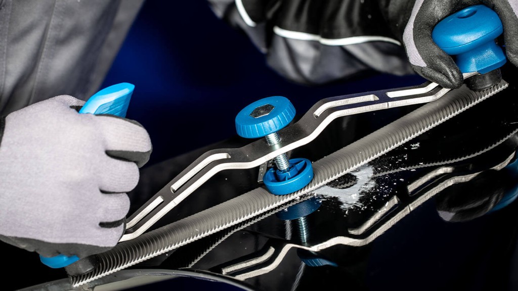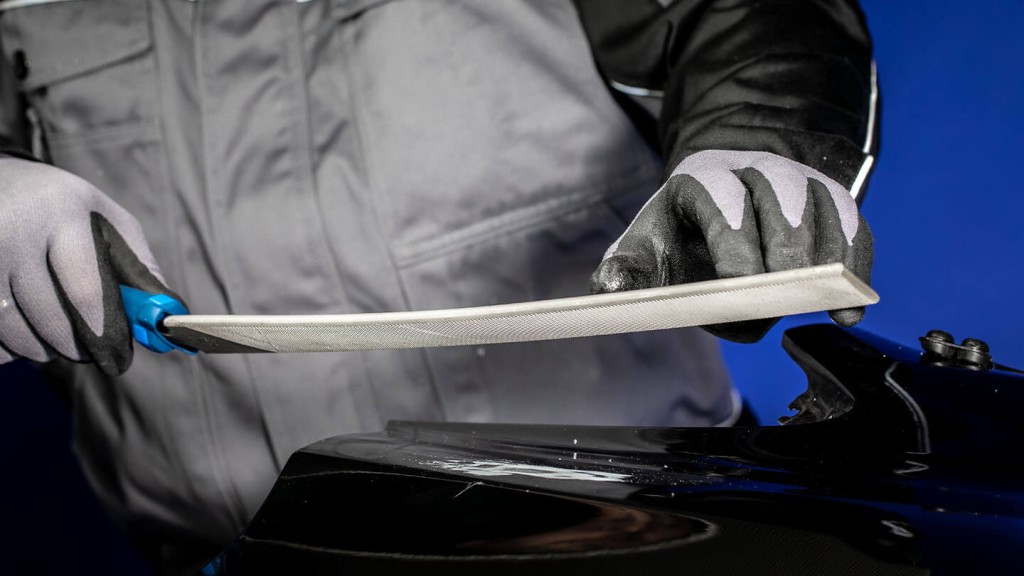 Karosseriefeilenblätter können in einen Karosseriefeilenhalter eingespannt werden, um an die zu bearbeitende Kontur angepasst zu werden.