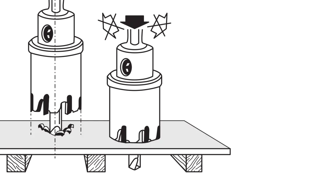 Üben Sie geringen und gleichmäßigen Druck auf das Werkstück aus, sobald die Schneidspitzen das Material berühren. Führen Sie das Werkzeuge mithilfe des Zentrierbohrers gerade auf die Werkstückoberfläche.
