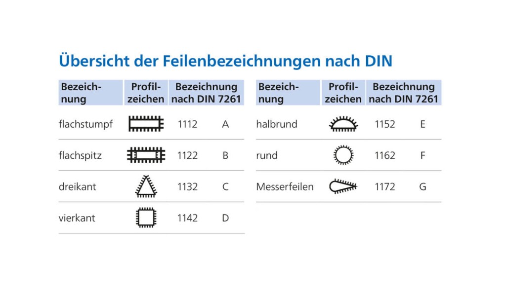 Die Bezeichnungen für Feilenprofile sind nach der DIN 7261 festgelegt. In der nachfolgenden Slide-Show finden Sie diese auf einem Blick: